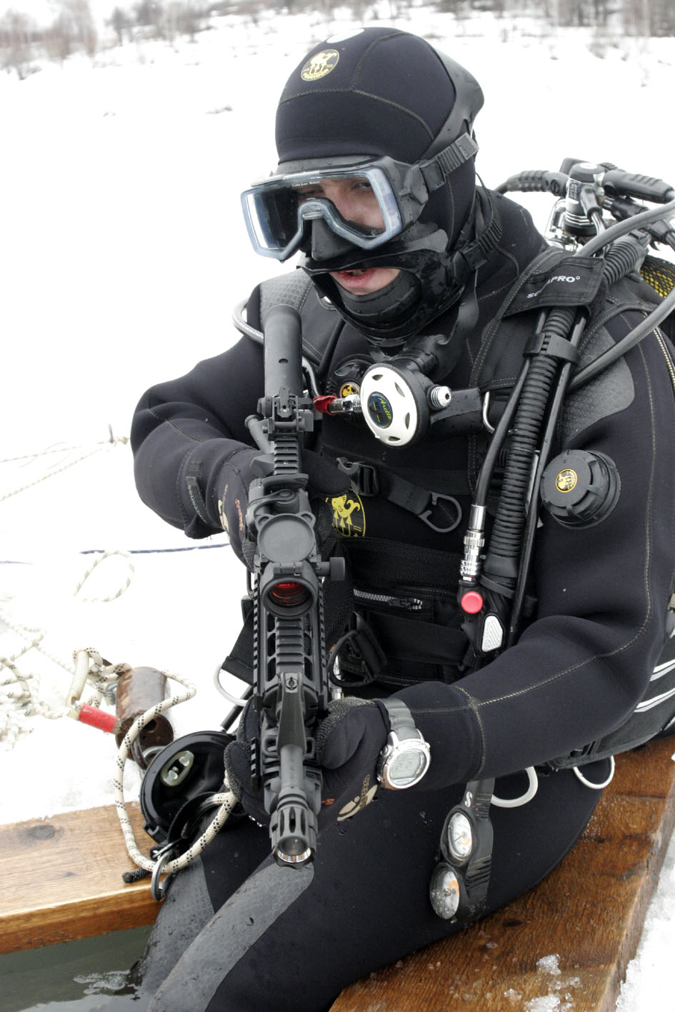 – Radni ronilac pre ulaska u vodu ne sme biti izložen hladnoći niti znojenju – navodi Draško S, komandir ronilačkog voda i iskusni ronilac. – Ronilački aparat mora do poslednjeg trenutka biti u toplom, gde ga treba i proveriti. Dugačak je spisak opreme i on treba da izgleda ovako: suvo ronilačko odelo, maska za celo lice, prsluk za regulaciju plovnosti, ronilački aparat sa dva nezavisna izvora disajnog medijuma i manometrima, ronilački sat ili računar, ronilački nož, peraja, ronilački tegovi, grudni pojas za osiguranje i životno uže – nabraja D. S.